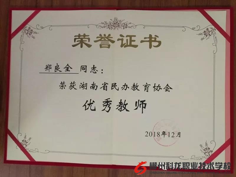 郴州科龙职业技术学校多年来一直是湖南省民办教育协会理事单位、会员单位,在此次表彰活动中我校郑良全校长被评为“优秀教师”。