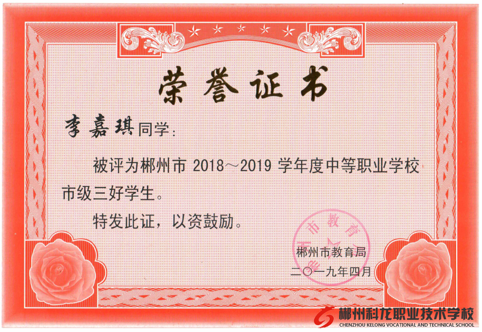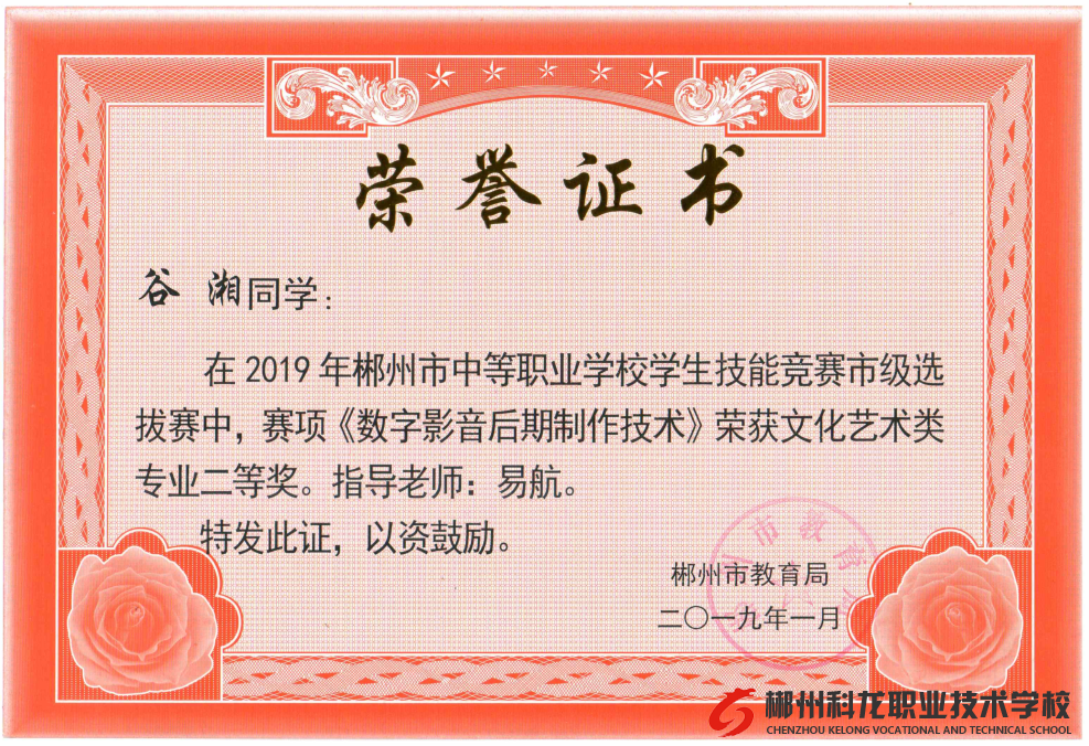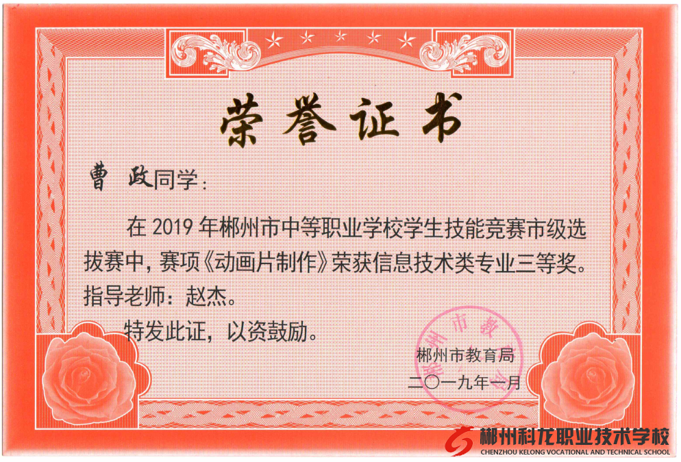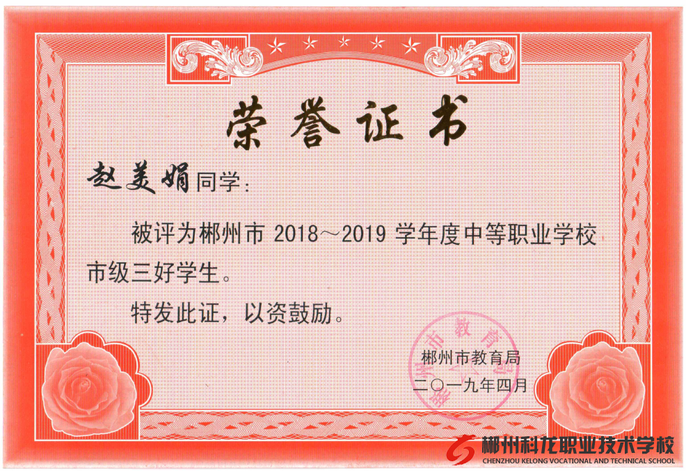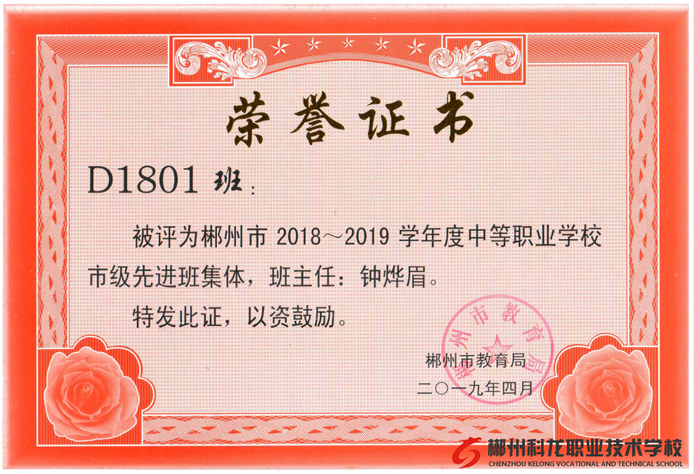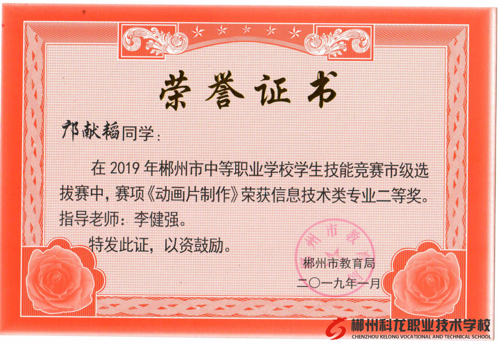 祝贺李嘉琪、赵美娟、李佳悦、李柏均、D1801班(班集体)、邝献韬、曹政、谷湘同学在2018—2019学年度表现突出,分别被评为市级三好学生、市级优秀班干部、市级优秀实习生、市级优秀班集体及在2019年郴州市中等职业学校技能竞赛市级选拔赛中,赛项《数字影音后期制作技术》、《动画片制作》分别荣获文化艺术类专业、信息技术类专业二等奖、三等奖。