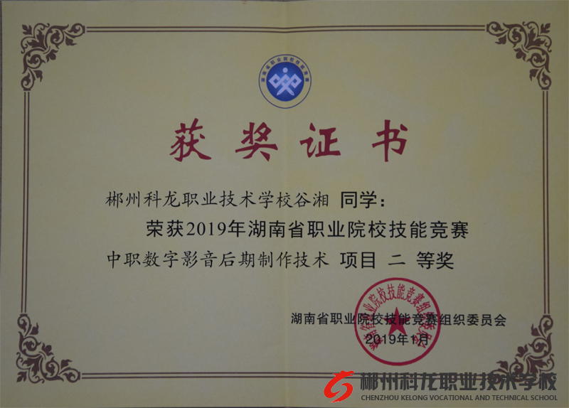由湖南省教育厅主办的2019年湖南省职业院校技能竞赛“中职数字影音后期制作技术”获奖名单于2018年12月26日揭晓。在此次比赛中,郴州科龙职业技术学校的谷湘同学喜获二等奖。